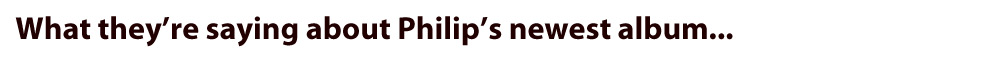 “Brings delight to a gay male audience who, just once, would like a gay romantic song that wasn't all heartbreak and despair. My husband, who long ago gave up seeking anything useful from mainstream artists that would speak to him personally, was enraptured by this album. He specifically noted that Philip was one of the best singers he'd heard in years." - Another Damn Blog
